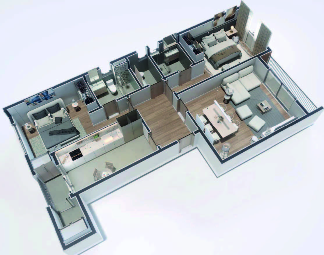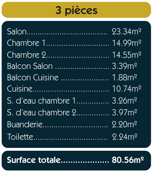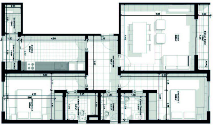 Avec deux belles chambres, une cuisine indépendante, un vaste séjour et plusieurs sanitaires, cet appartement a tout d’une résidence familiale moderne. Son agencement facilite la vie quotidienne dans un espace bien pensé et agréable à vivre.